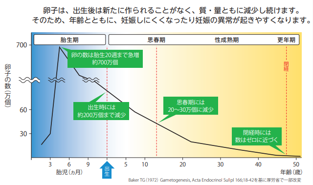 女性は生まれたときにすでに一生分の卵子のもとになる細胞を持っており、年齢とともにその数は減少し、質も徐々に低下していく仕組みです。